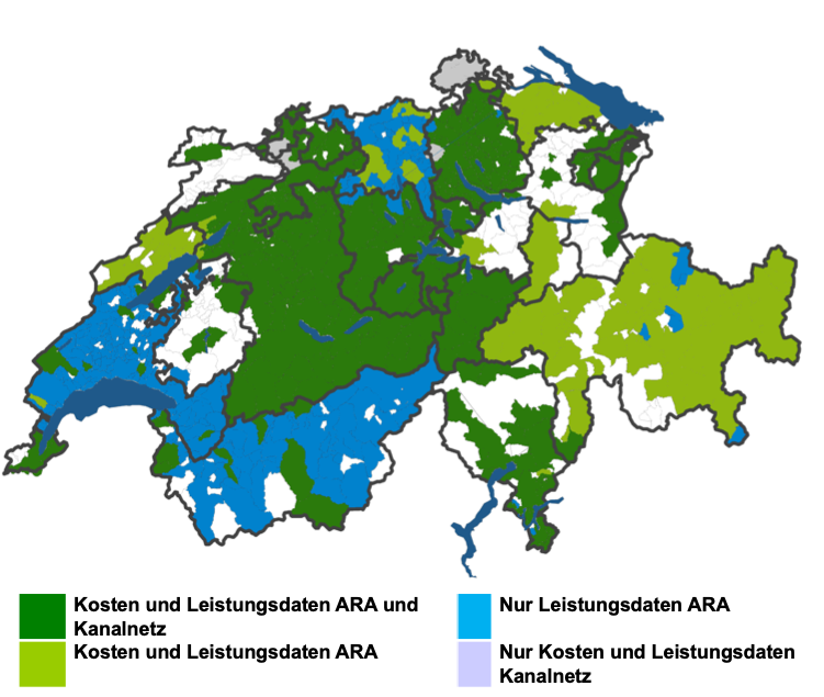 Erhoben werden die Daten nach den beiden Geodatenmodellen «ARA-DB» (ID 134.5) und «GEP» (ID 129.1). Die Erhebung 2020 wurde angestossen, damit 10 Jahre nach der letzten Erhebung (VSA und OKI, 2010.) die Entwicklung der technischen Anlagen und des Gewässerschutzes dokumentiert und verfolgt werden kann. Die Datenlieferung der Kantone beruht auf einer freiwilligen Basis, die Daten stehen jedoch immer mehr fast flächendeckend zur Verfügung: